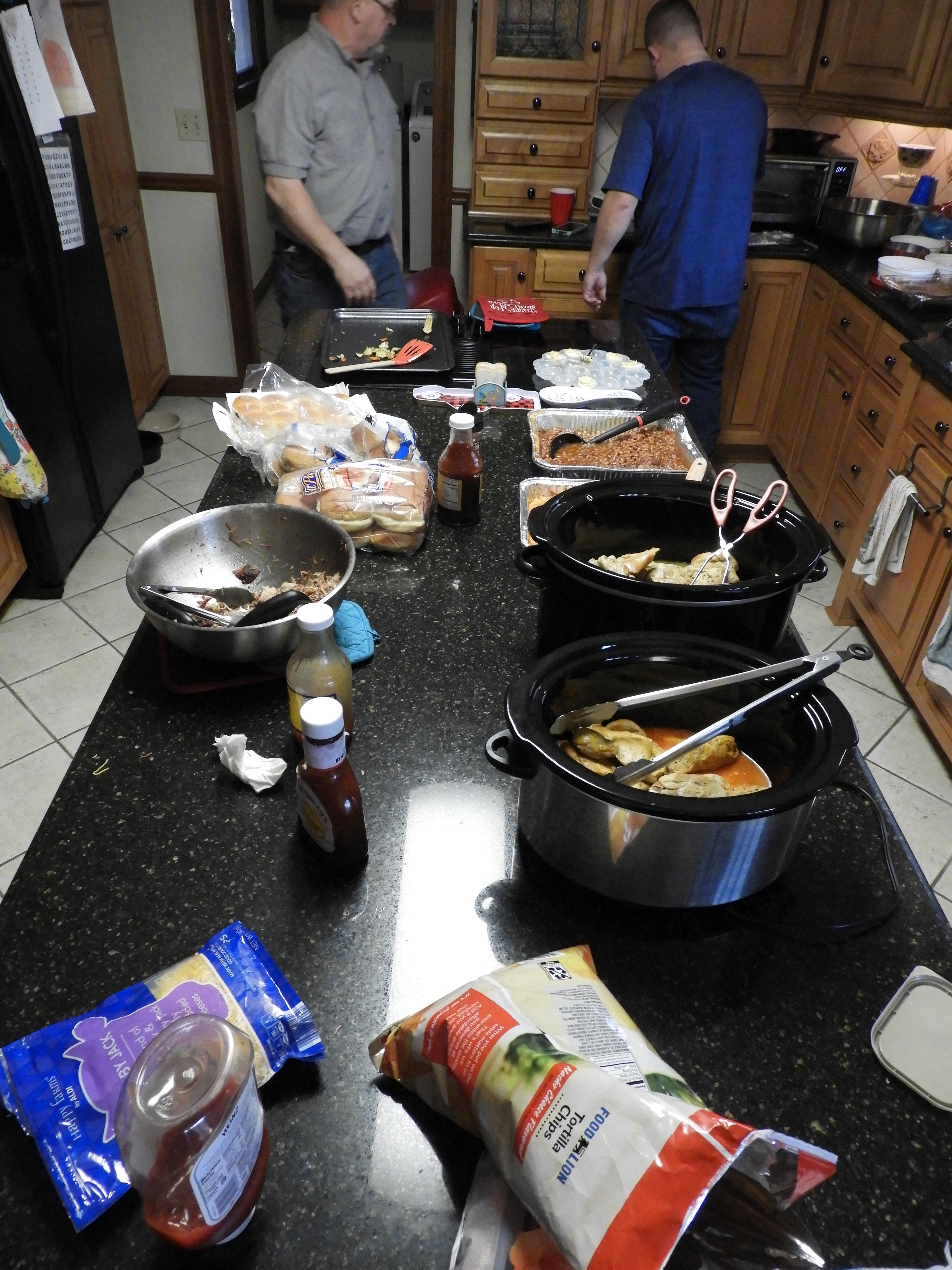The menu was smoked pork butt (thanks to Brad!  It was YUMMY!), chicken, cheesy potato casserole, baked beans, roasted veggies, deviled eggs, cole slaw, Hawaiian sweet rolls, chips, cookies, brownies, muffins and an ice cream cake for Ryan's birthday!